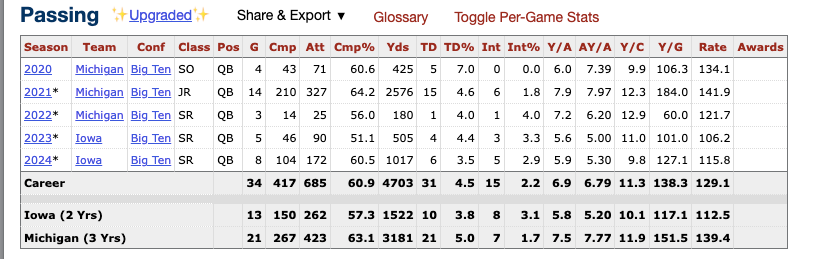 Not everything in the Big Ten has been positive, however. The NCAA recently vacated some of Iowa’s wins from 2023 due to tampering involving QB Cade McNamara. While a member of the Michigan Wolverines, McNamara would learn he would have to compete for the starting job with JJ McCarthy. Rather than seeing that path play out, McNamara got a jump on conversations with Iowa and eventually joined the Hawkeyes. He produced the following line: