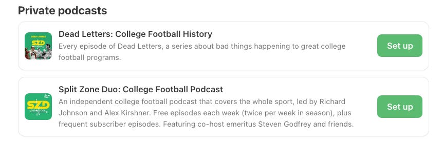 There’s now a standalone podcast feed on Apple, Spotify, and the other major podcasting apps. It’s got a handful of free episodes, and subscribers can set up their personal feeds in their publication settings. It’s very easy from here. Set up your premium episode feed the same way you set up your regular SZD feed: