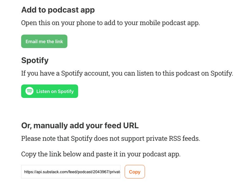 (If you haven’t set up an RSS feed, you can do that in your Substack settings. In most podcast players, you can then paste the link into the app, and voila.)