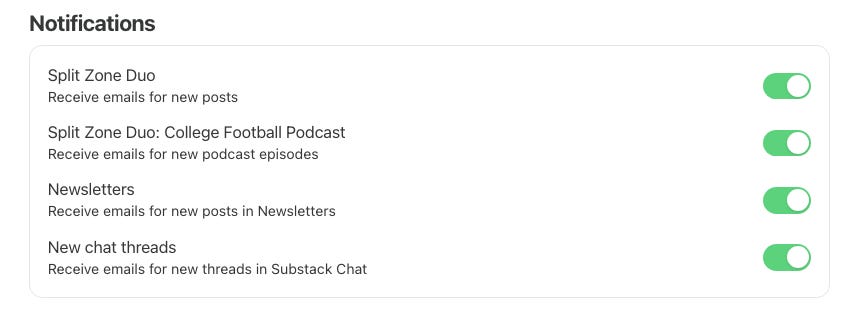 The “Split Zone Duo” section up top is for important podcast updates and events. The other toggles are self-explanatory: for podcasts, newsletters, and chats.
